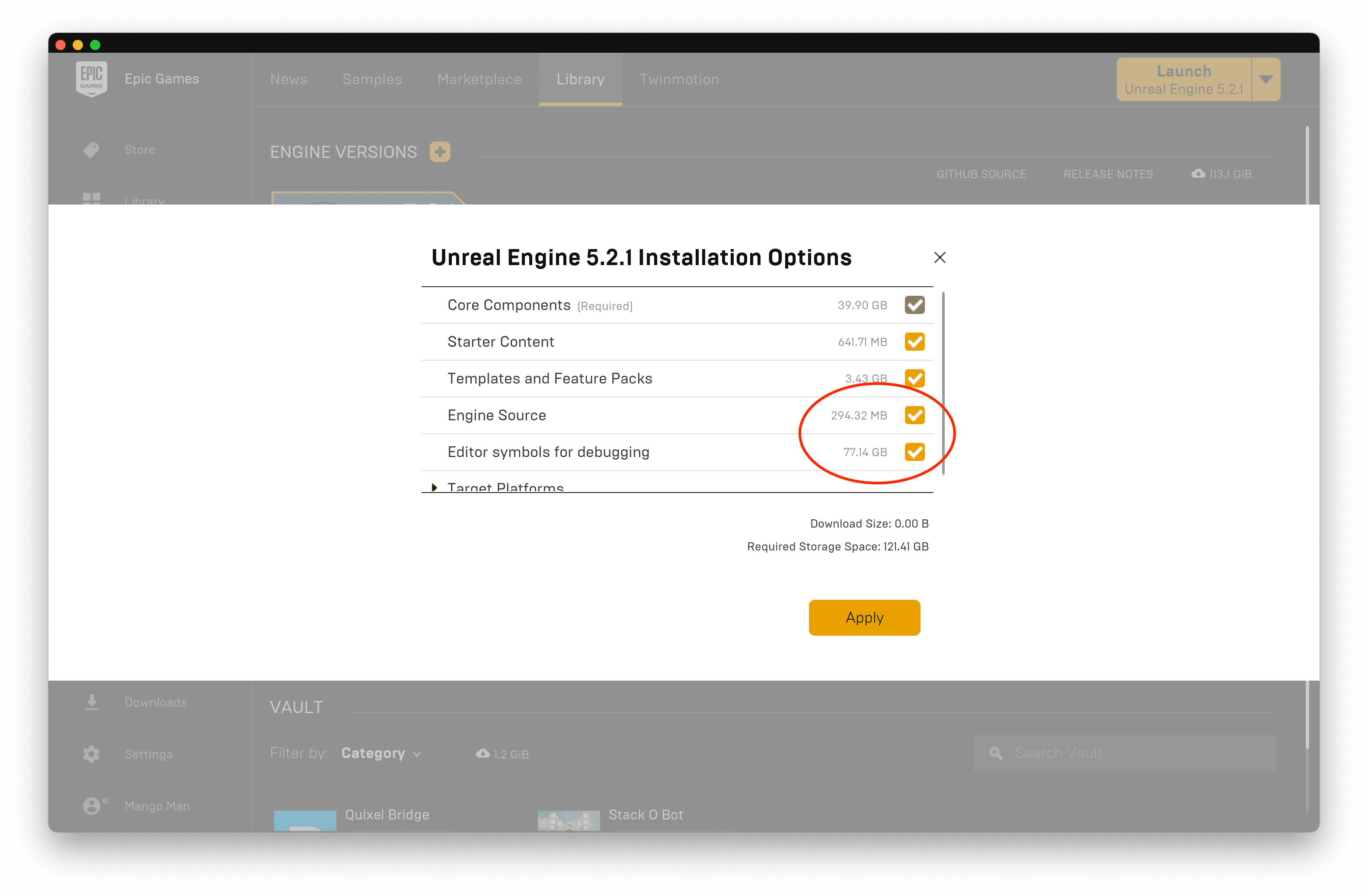 This will kick off downloads for the engine source code and debug symbols, respectively. At nearly 80 GB, they are hefty (but worthwhile) downloads, so make sure you have disk space available before hitting apply.