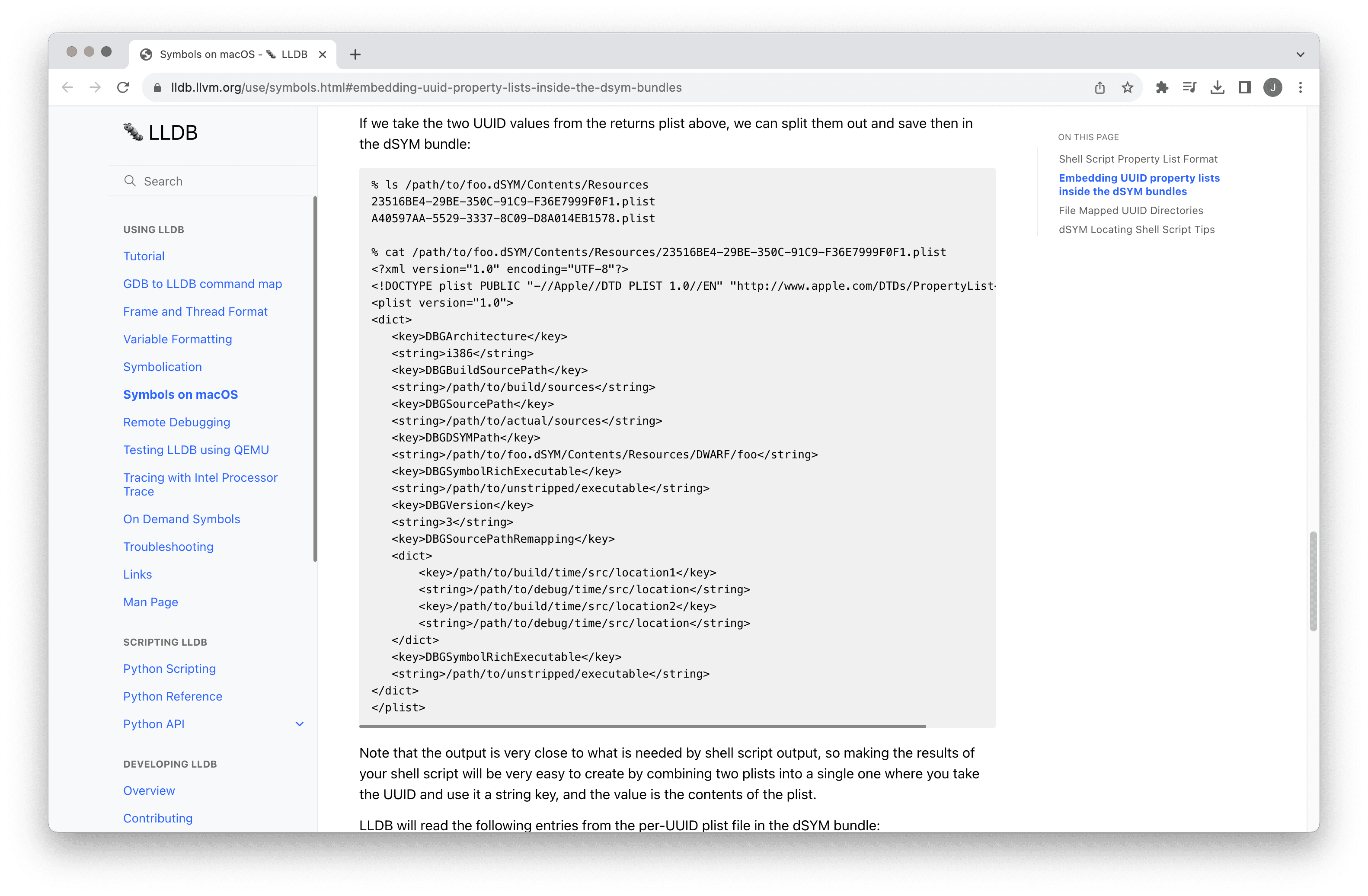 Since dSYM files are bundles, you can also place UUID info plists files inside your dSYM bundles in the Contents/Resources directory. One of the main reasons to create the UUID plists inside the dSYM bundles is that it will help LLDB and other developer tools show you source. LLDB currently knows how to check for these plist files so it can automatically remap the source location information in the debug info.