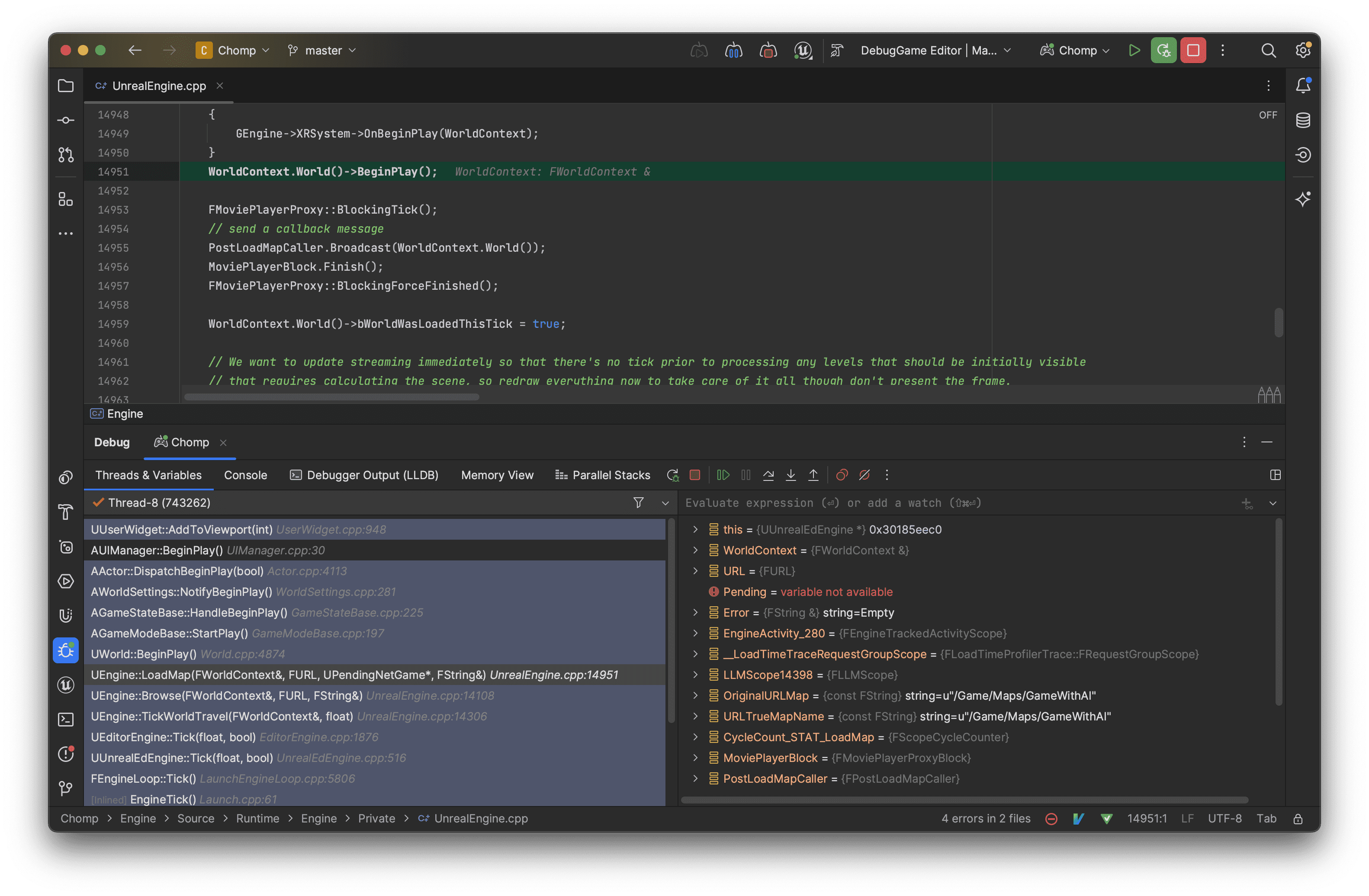 files properly configured for lldb to automatically load them, your call stacks will now map to the underlying engine source. Here's me giving the setup a go in JetBrains Rider: