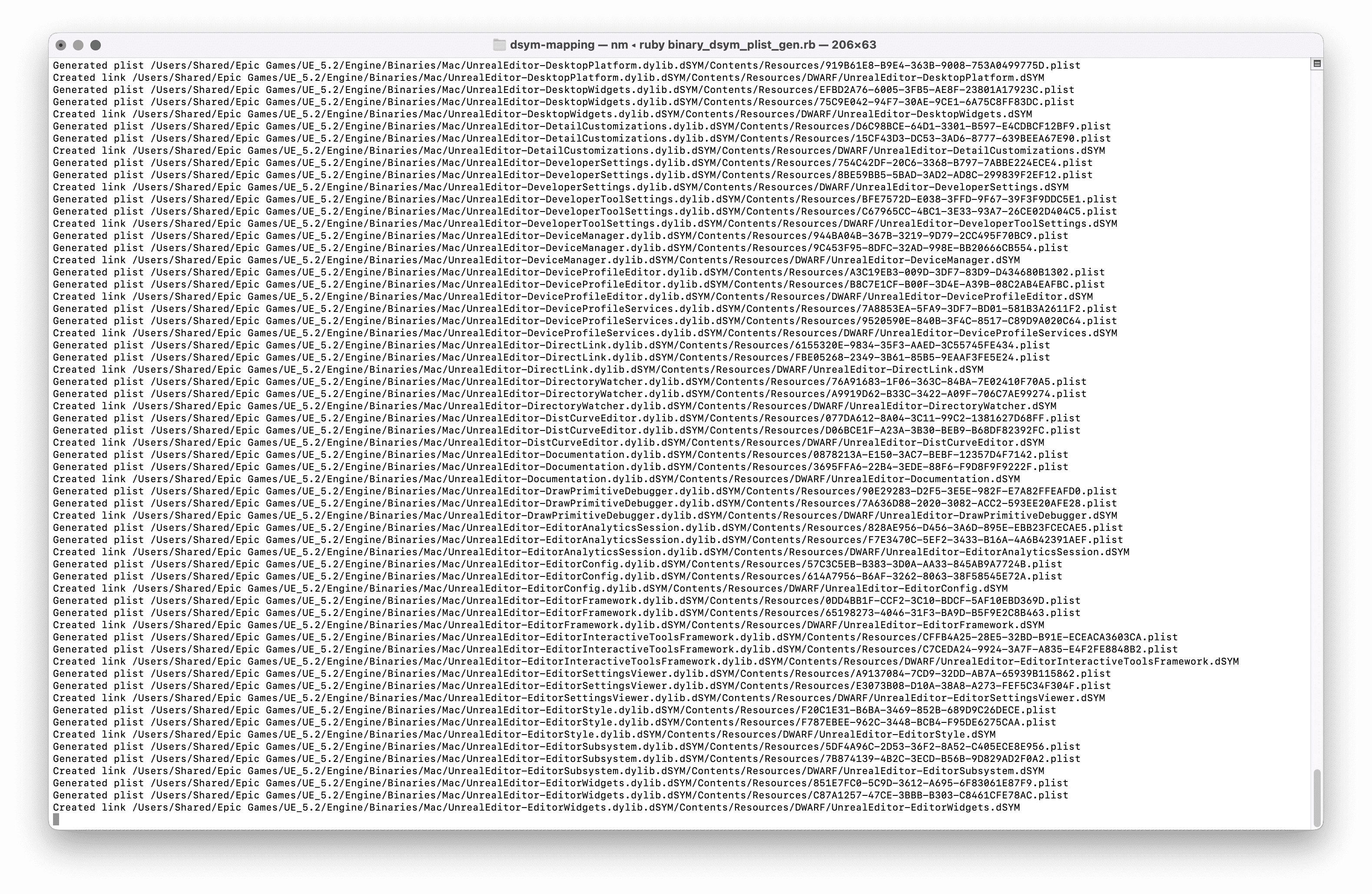 generation script, customized for Unreal usage: https://gist.github.com/intvoker/46450ab4090c6edbc4794af99caf181d - LLVM's official docs on how debug symbols work: https://lldb.llvm.org/use/symbols.html#embedding-uuid-property-lists-inside-the-dsym-bundles
