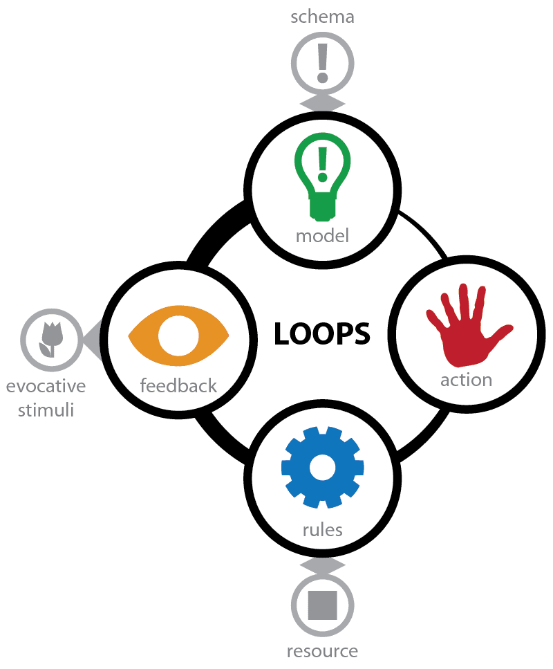 A loop is a conceptual diagram of how a player interacts with your game. A player begins with an initial understanding (model) of your game, and through performing actions within your game and triggering your game's processing of its rules, the player learns how the game works through feedback.
