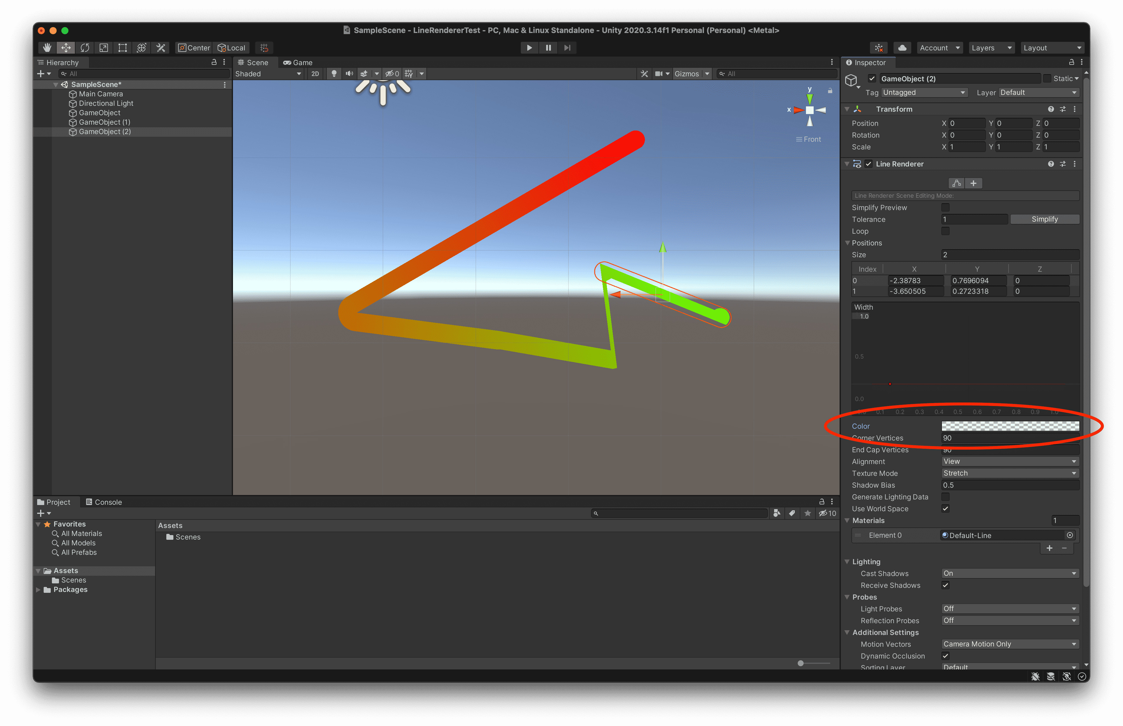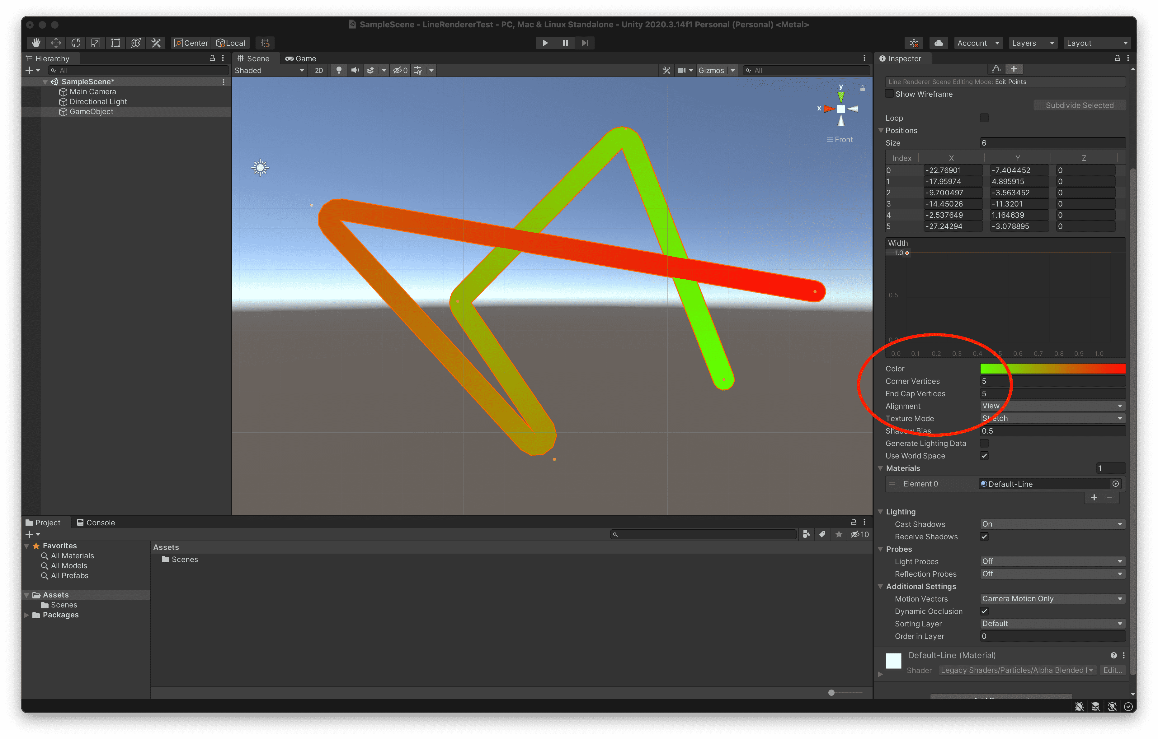 Once set, you can select line colors for the start and end of the line, and see the colors reflected in the Scene view: